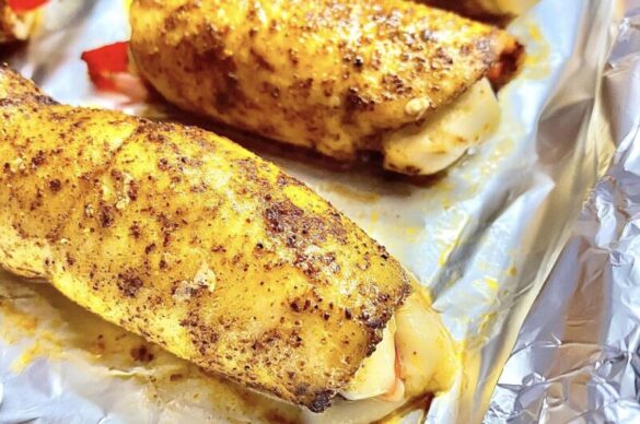 Lay the chicken strips out, add a square of cheese and a couple of red pepper strips, roll up and place on a baking tray. Bake in the center of the oven for 20 minutes, turning over halfway through cooking.