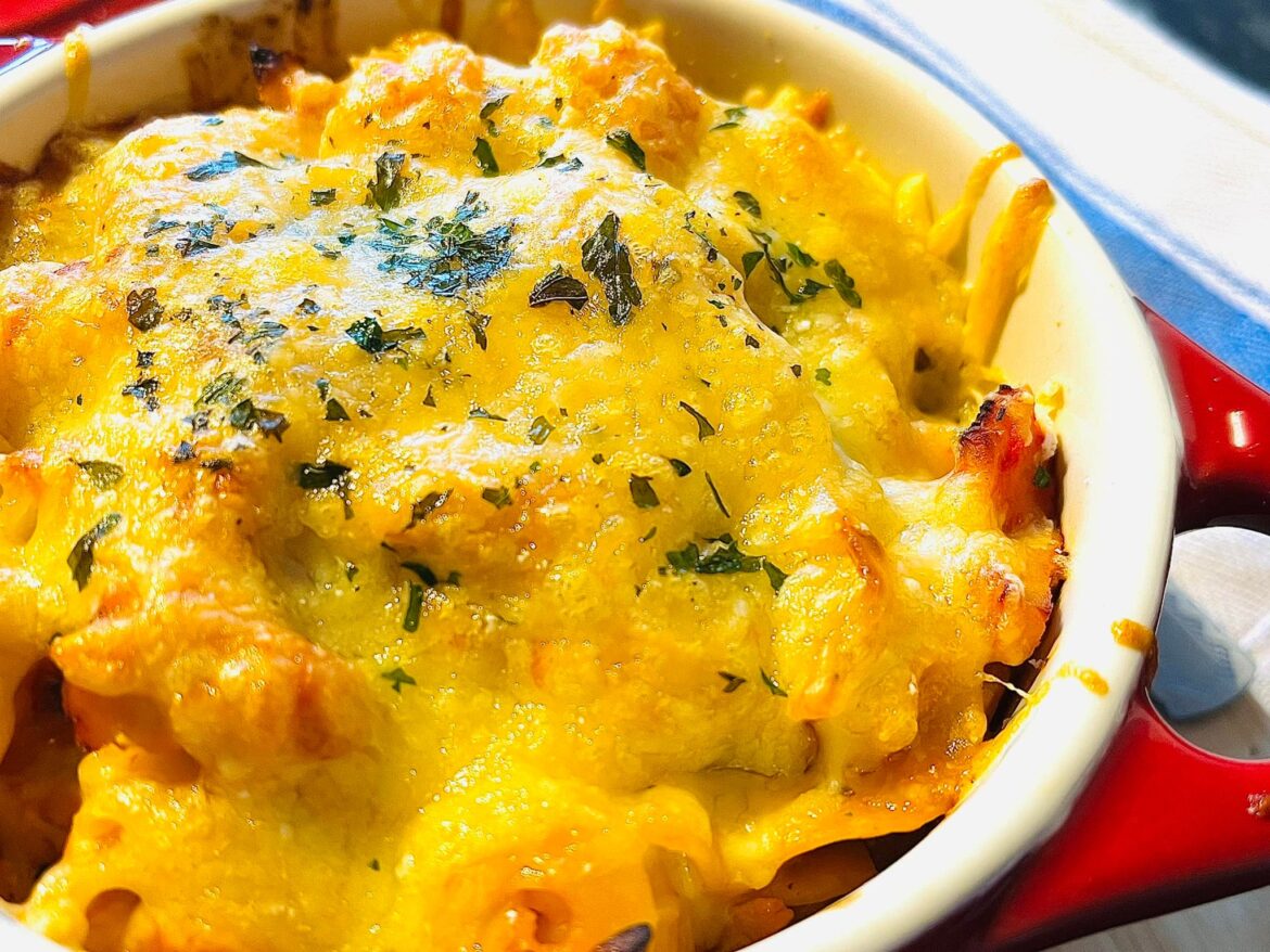 NOTE:Â If the pan becomes a little dry, add some of the pasta water to loosen off the mixture. - Spoon the pasta mix into individual oven proof bowls and cover each bowl with 40 grams of reduced fat cheddar cheese.